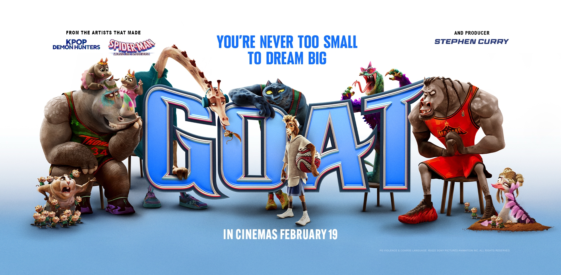 From Sony Pictures Animation, the studio behind Spider-Man: Across the Spider-Verse, comes GOAT, an original action-comedy set in an all-animal world. The story follows Will, a small goat with big dreams who gets a once-in-a-lifetime shot to join the pros and play roarball – a high-intensity, co-ed, full-contact sport dominated by the fastest, fiercest animals in the world. Will’s new teammates aren’t thrilled about having a little goat on their roster, but Will is determined to revolutionise the sport and prove once and for all that “smalls can ball!”AnimatedPT1H40MPG2026-02-19Caleb McLaughlin